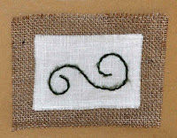 The dimensions of the boxes are really convenient, they can be stacked under the table (which is a former dining table), and there is still a bit of space to stuff an odd piece of paper of cardboard on top (until it’s time to tidy up again). I’ve made the labels for the boxes using leftovers of natural brown hessian and white linen fabric. The hessian part measures 12 x 17 cm, linen part is 8.5 x 12 cm. First the picture is painted/embroidered/glued onto/attached to the white part of the label, then the white part is machine-stitched onto the the hessian part. Finally, the labels are glued onto the boxes, on the same side of each box.
